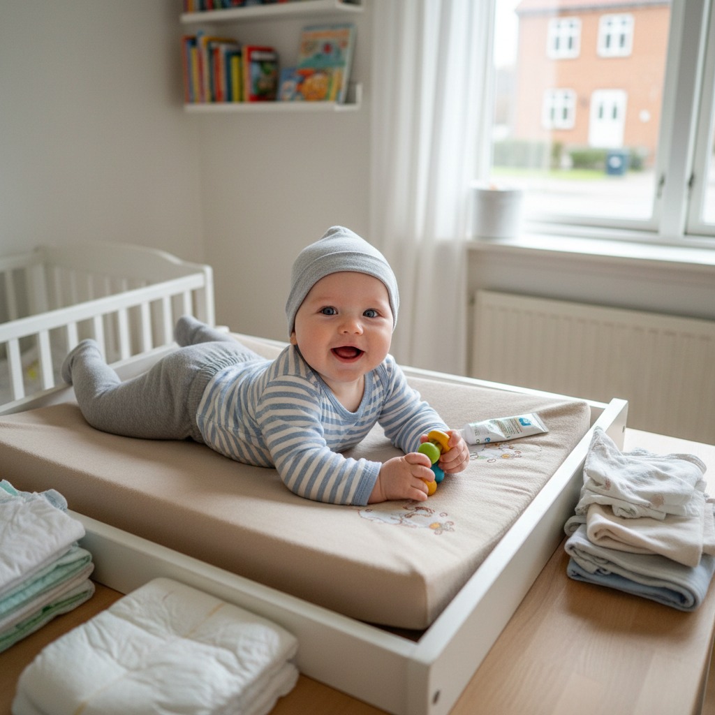 En organiseret pusleplads med bleer, vådservietter/skumservietter og skiftetøj inden for rækkevidde gør bleskift hurtigere og mere effektive, hvilket både sparer tid og reducerer stress i den første tid med baby.